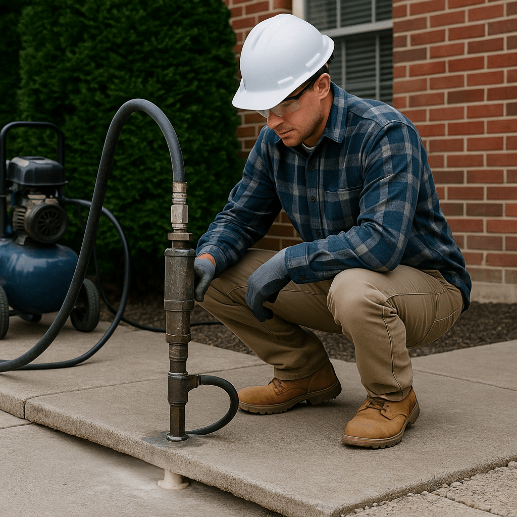 High-strength grout is applied under controlled pressure to fill voids and lift the settled concrete, carefully restoring your foundation’s original level without damaging surrounding structures.